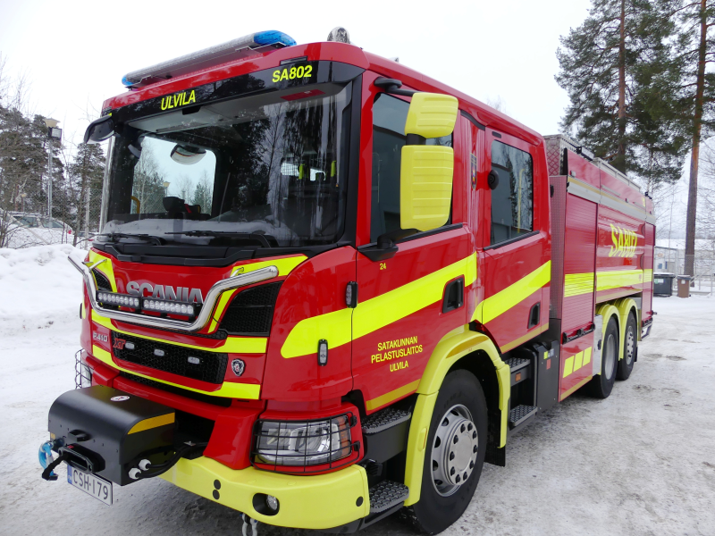 Pelastusopistolle toimitetut uudet Saurus FSC29 sammutusautot. Scania P370B 4x2NA alusta Esteri D-240 peräpumppu Warn 6,8 tn hydraulivinssi Saurus 10 kW hydrauligeneraattori